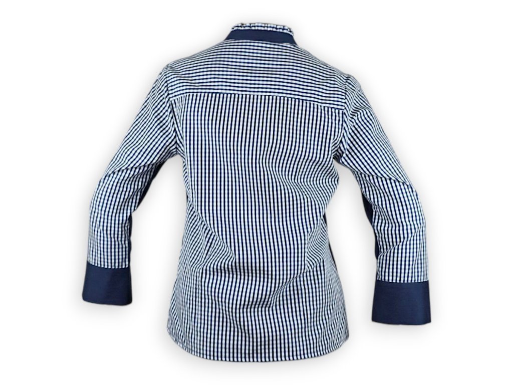 Dámská polokošile je z tkaniny bez elastanu a nemá zapínání. Má jemně volnější střih, aby šla zastrčit do sukně nebo kalhot a trochu podkasat. Nemá být upnutá, to byste ji neoblíkly.