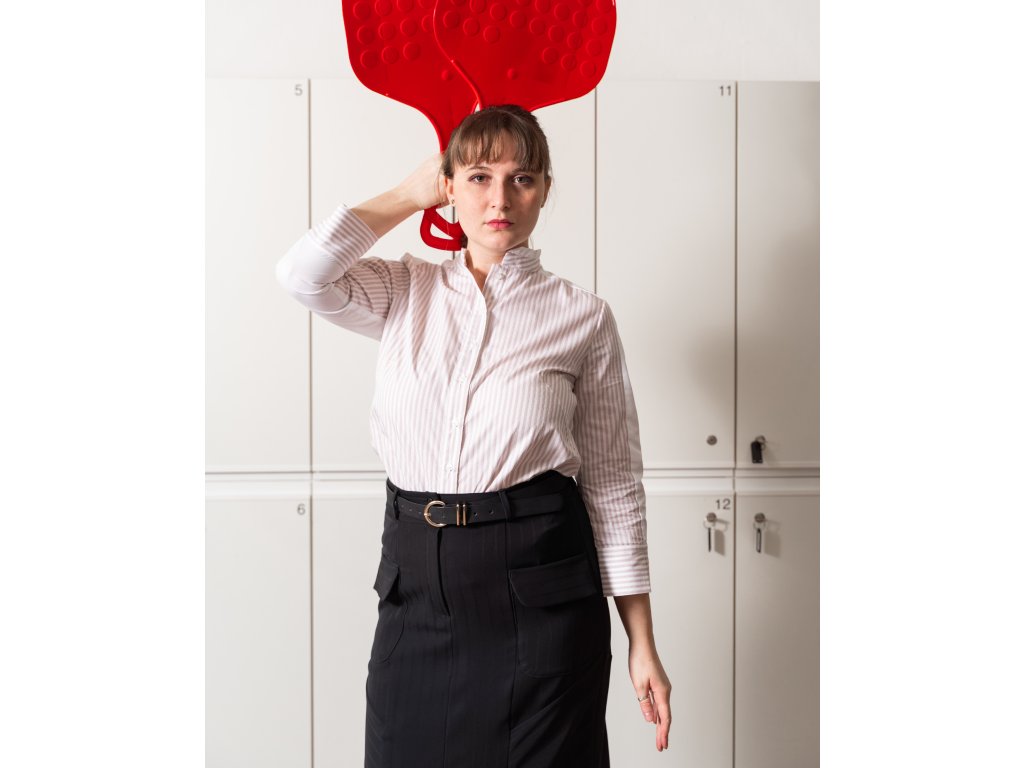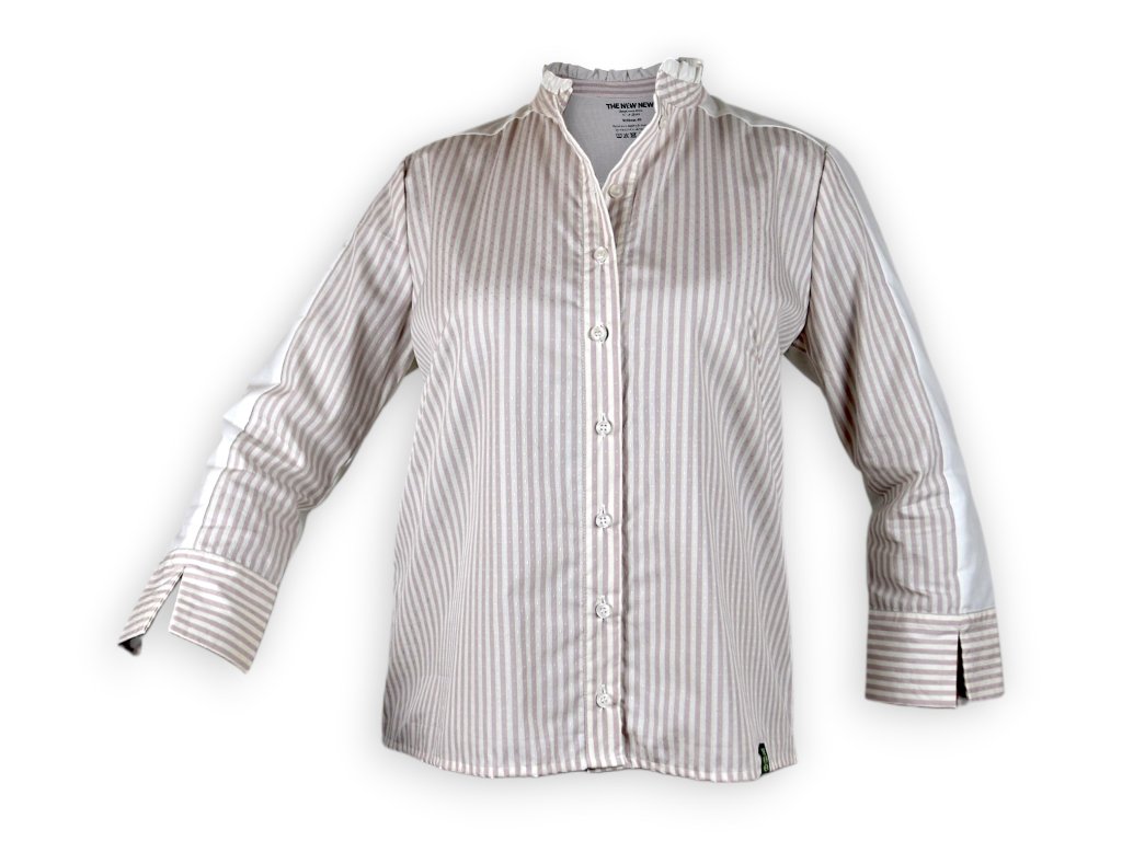 Košile s řasením je z tkaniny bez elastanu a je celopropínací. Střih je volnější a je myšlený tak, že při zastrčení do sukně nebo kalhot je košile podkasaná.