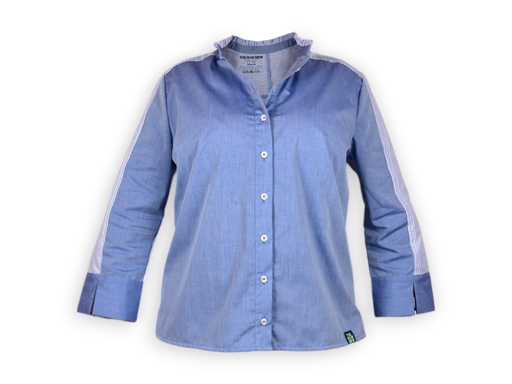 Košile s řasením je z tkaniny bez elastanu a je celopropínací. Střih je volnější a je myšlený tak, že při zastrčení do sukně nebo kalhot je košile podkasaná.