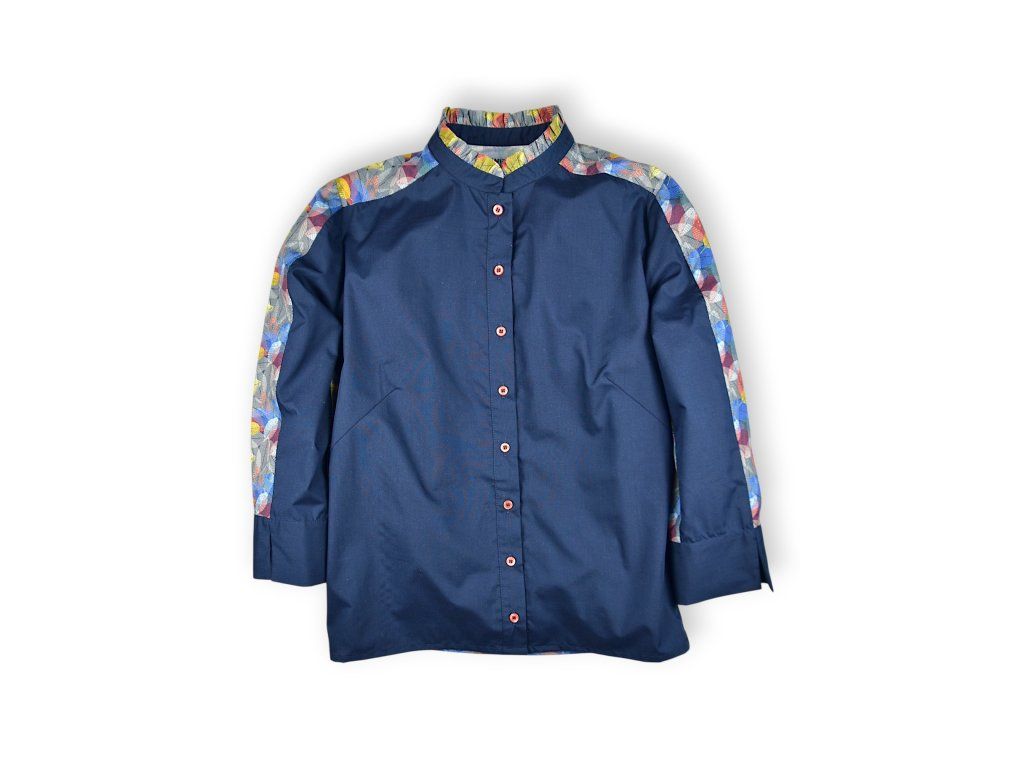 Košile s řasením je z tkaniny bez elastanu a je celopropínací. Střih je volnější a je myšlený tak, že při zastrčení do sukně nebo kalhot je košile podkasaná.